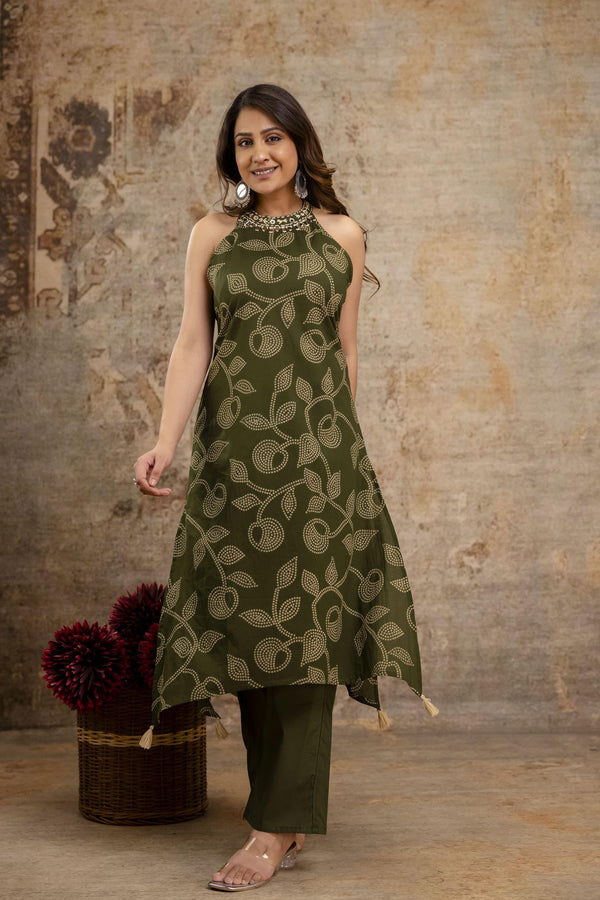 Cotton Bandhej Halter Neck Coordset in lively Mehandi green. Crafted from breathable cotton, it keeps you cool while the playful bandhej print adds a fun, traditional twist. The halter neck design highlights your shoulders, making it perfect for sunny days and festive vibes alike. Mix comfort with style effortlessly!