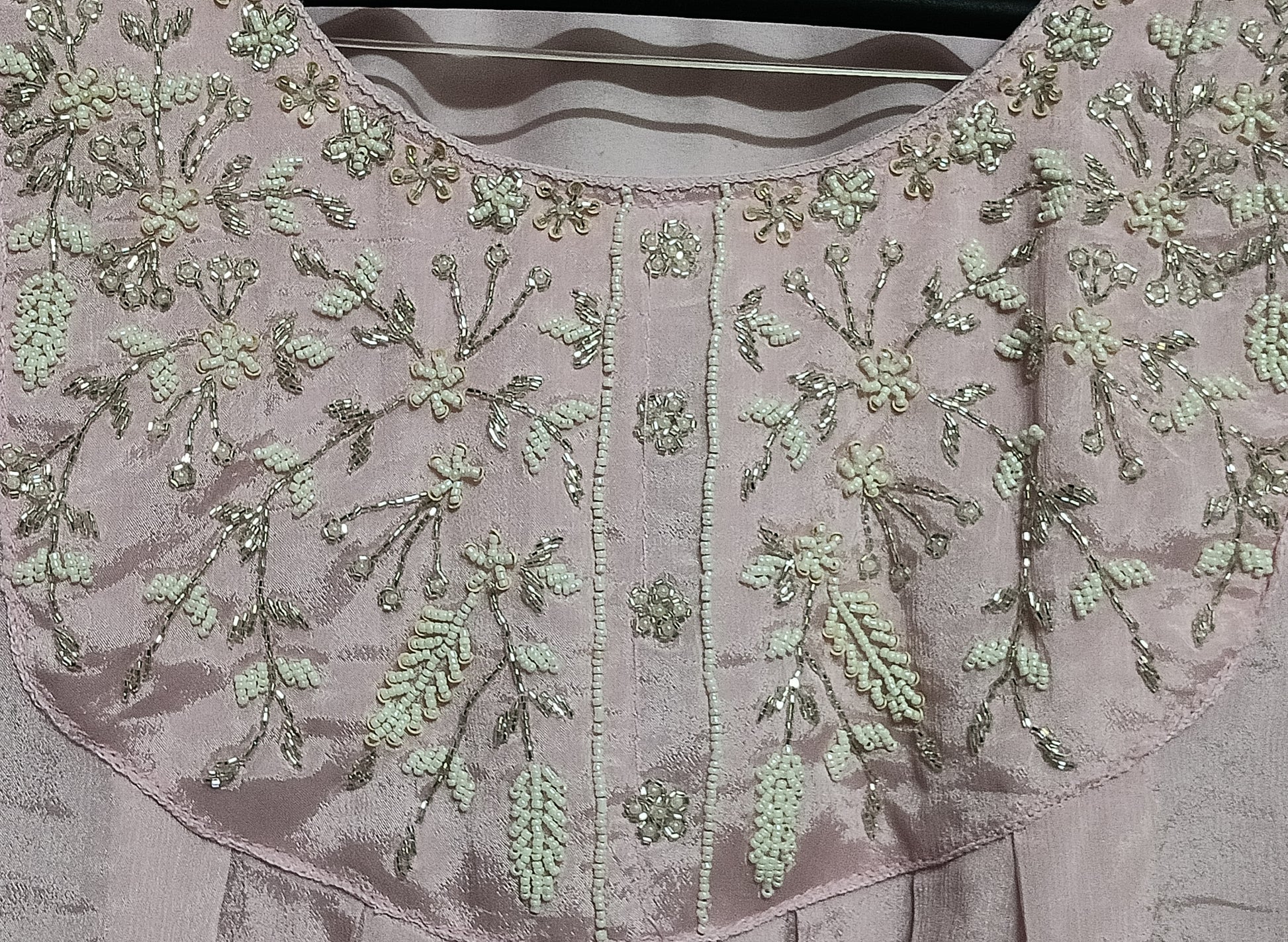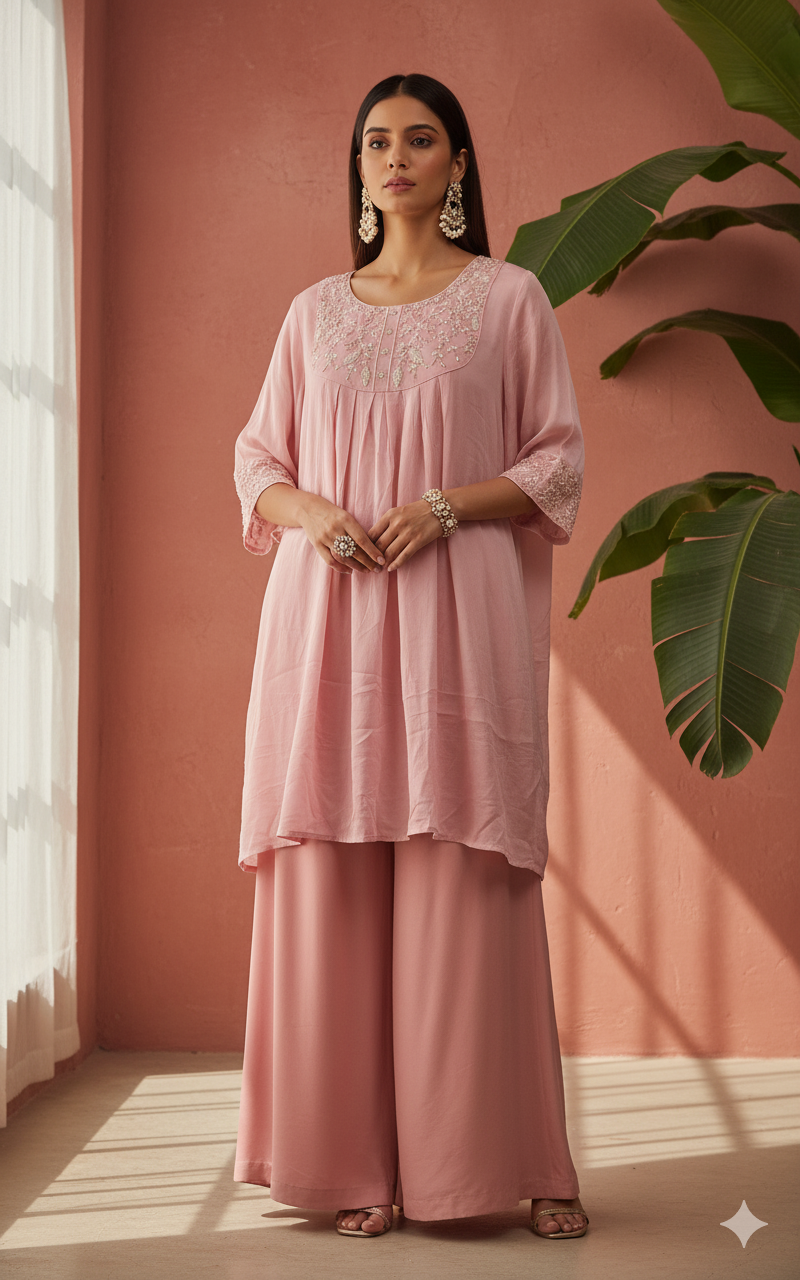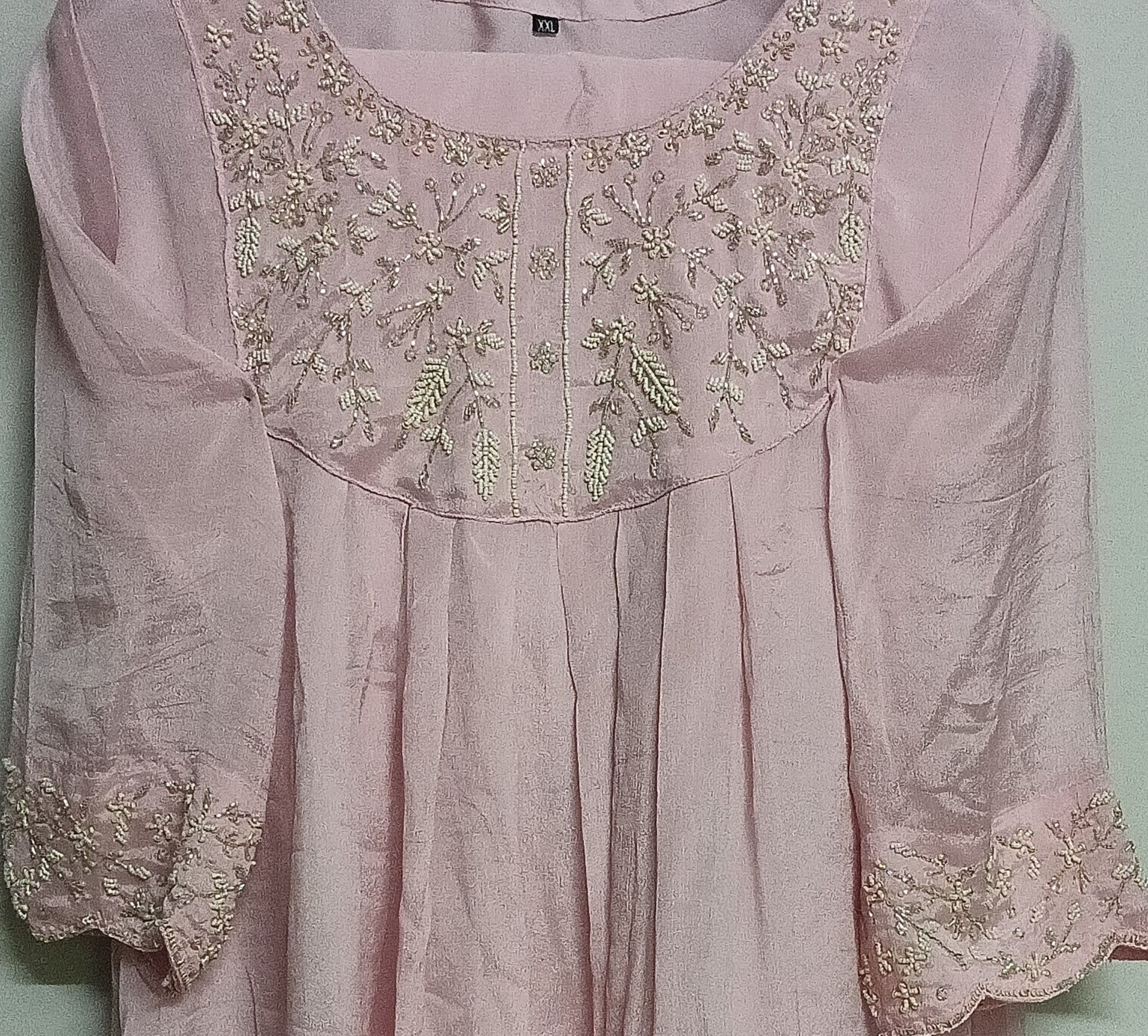 Pure Premium Butter soft Chinon Heavy fully loaded white Pearl work on yolk and sleeves of knee length Top and Palazo set in soft light elegant pink 🩷 colour to grab anyone's Heart and look in any party