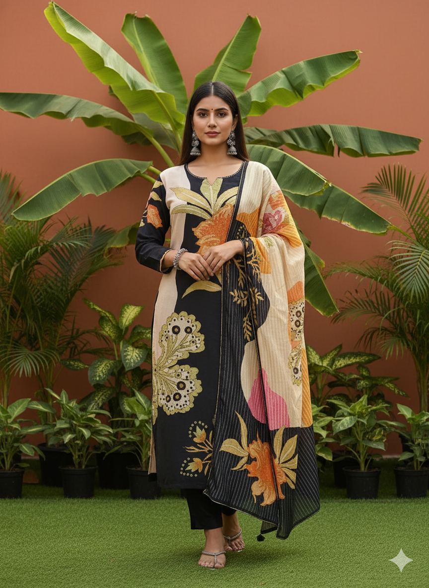 Pure Premium butter Maslin Three Piece Suit In Black and ivory colour fully digital printed and Soft sequence Highlighted on all over print Of top and dupatta Giving a beautiful elegant premium look on every occasion with beautiful Tussles on four corners of dupatta and pure premium Maslin bottom