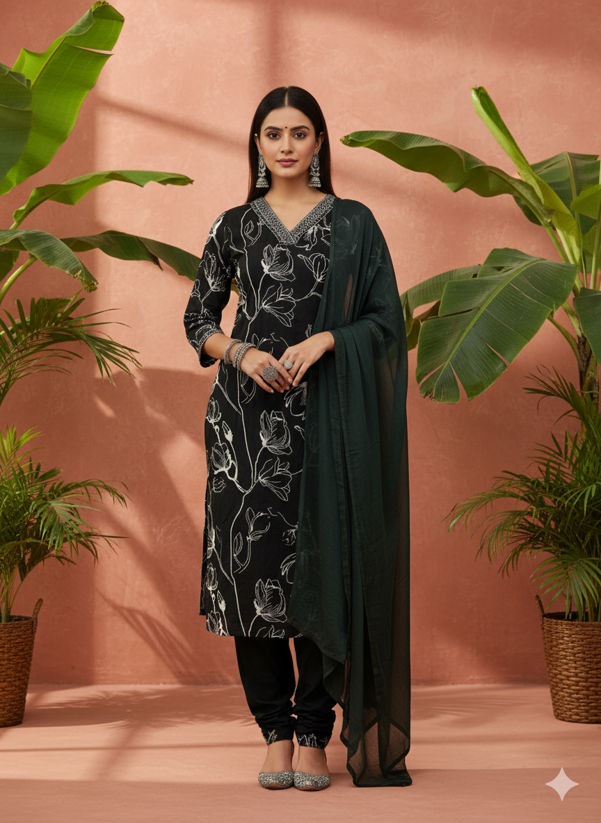 Pure Premium German Rayon Three Piece Suit in Nevy blue colour with foil mirror and thread work on neck detailing self digital printed with chiffon full size Duppata with top fabric strip border and bottom with same border very pretty and too comfortable and coziness to carry simply every time